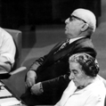 Visite d'Anouar El-Sadate (1918-1981), homme d'Etat égyptien, en Israël. Golda Meir, ancienne Premier ministre israélienne, lui offrant un cadeau. 21 novembre 1977.